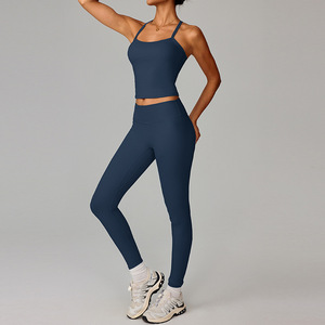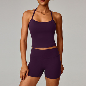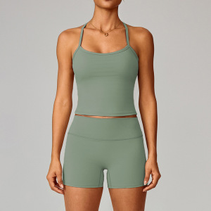 欧美紧身磨毛瑜伽服套装速干健身短裤背心户外跑步运动套装女8519