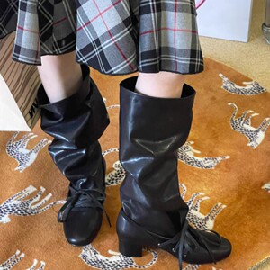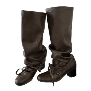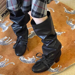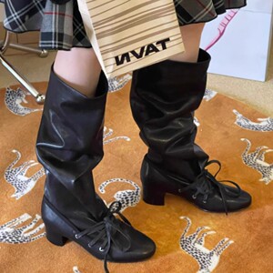 现货~ 复古绑带新款小众设计感裤筒靴粗跟厚底长靴尖头系带骑士靴
