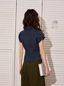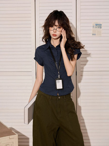 美式辣妹藏蓝色条纹正肩衬衫女夏设计感修身收腰紧身短款上衣衬衣