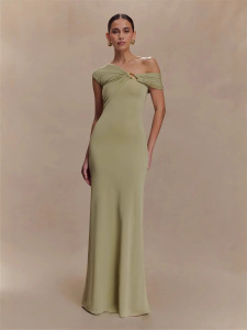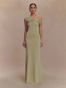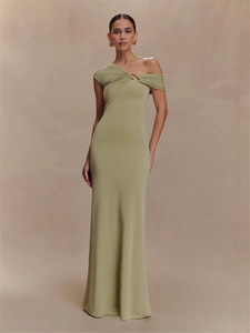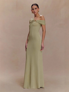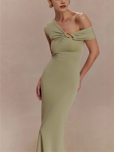 2025 越境ヨーロッパとアメリカの夏の新しいスリムでセクシーなホリデースタイルの斜め肩プリーツウエストソリッドカラードレス婦人服
