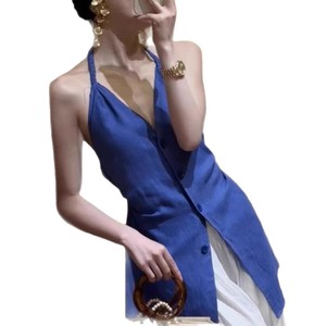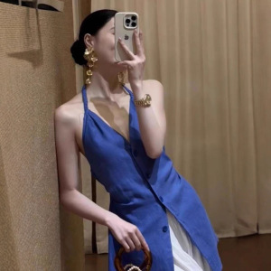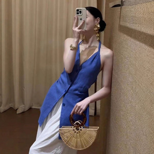 超好看独特漂亮高级感小众不撞衫上衣高端欧货蓝色挂脖吊带衬衫女