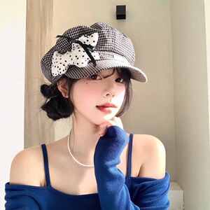 可爱波点小狗格纹贝雷帽女春夏季薄款显脸小八角帽大头围画家帽子