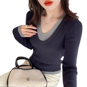 工場直送の韓国風カラーブロックフェイクツーピースウールセーター、秋冬の女性用、高級感のあるユニークで美しいトップス