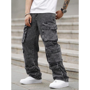 跨境Men's Street Style Washed Wide Leg Cargo Jeans Loose Fit
