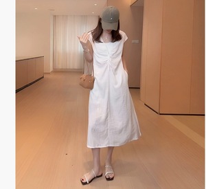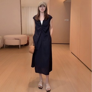 7348现货 法式浪漫风V领褶皱修身短袖长裙夏季显瘦收腰无袖连衣裙