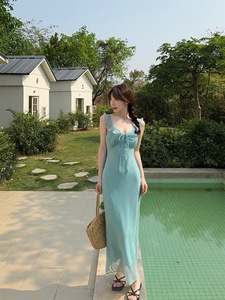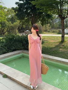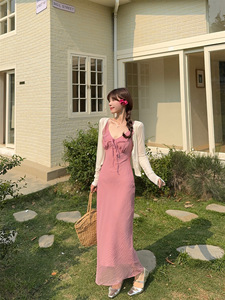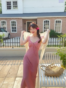 2025夏季新款法式气质小飞袖荷叶边系带连衣裙收腰显瘦吊带长裙女