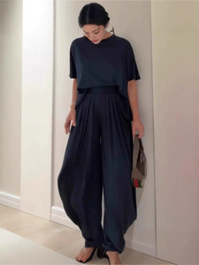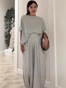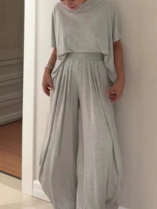 2025 新しいヨーロッパとアメリカのクロスボーダー Amazon 独立したステーションカジュアルルーズで快適な無地ラウンドネックワイドレッグパンツスーツ