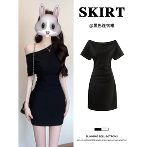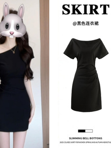 法式黑色斜肩连衣裙女夏季巨好看掐腰裙子短款收腰a字后妈包臀裙