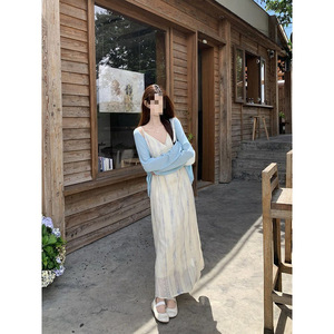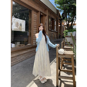 法式V领吊带连衣裙女2025夏季新款宽松度假风洋气高腰中长款裙子