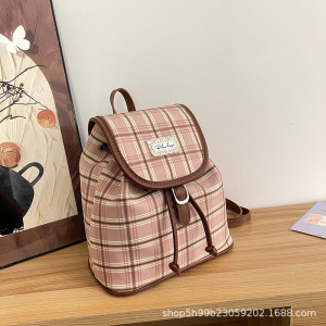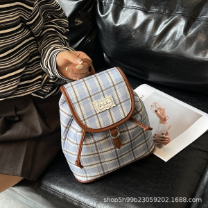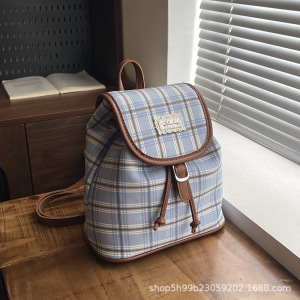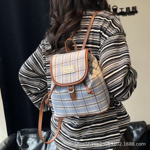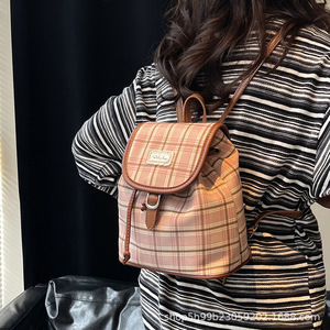 韩系小众格纹双肩包女复古学院风休闲百搭水桶包时尚学生通勤背包