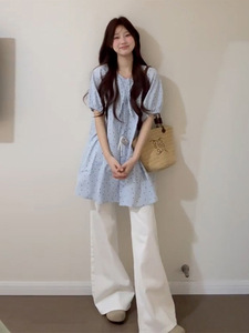 蓝色波点泡泡袖衬衫女夏季2025新款小众设计感宽松慵懒温柔风上衣