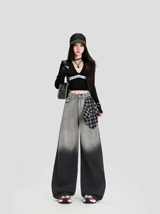 拖地长裤女秋季新款设计感格子飘带高腰显瘦洗水阔腿牛仔裤