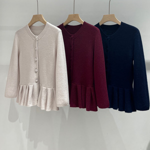 BC女秋冬新款圆领纯色羊绒羊毛针织开外套纯色短裙式下摆上衣
