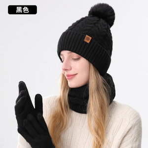 冬季针织帽 手套冬季女士户外骑行双层加厚保暖帽子围脖三件套跨