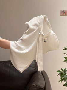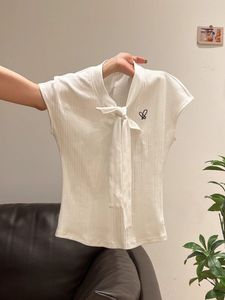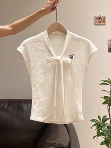 白色系带V领刺绣短袖T恤女夏季新款学院风修身显瘦设计感小众上衣