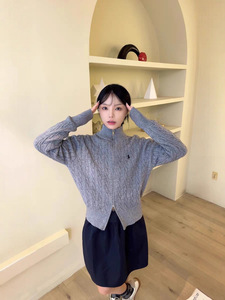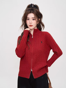 三股包芯纱美式小立领双拉链开衫毛衣女打底设计感刺绣上衣针织外