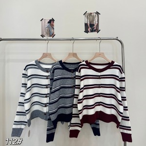 韩系短款条纹撞色针织开衫女早秋小个子宽松圆领毛衣外套外搭上衣