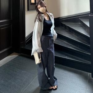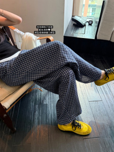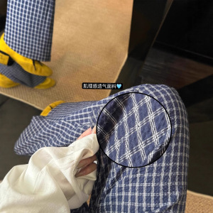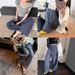 广州十三行高货爆款~海岛泡泡棉格子裤微皱肌理感宽松镰刀裤阔腿
