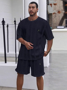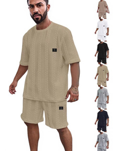 欧美跨境亚马逊纯色提花夏季休闲圆领套头短袖短裤运动男士套装男