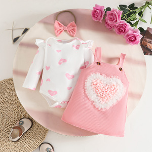 甜美女婴秋冬季长袖爱心三角哈衣+灯芯绒网纱立体爱心背带裙+发带