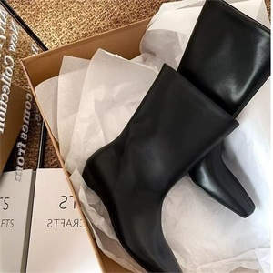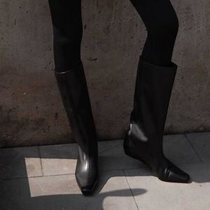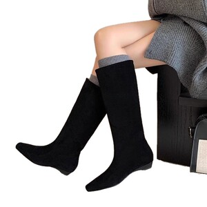気質スクエアトゥハイウェッジブーツ女性用2025春秋新作ローヒールスリーブシンプル膝上なしナイトブーツ