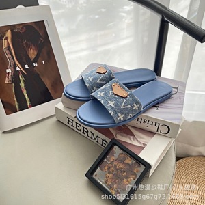 牛仔布印花一字拖鞋女2025夏季新款外穿时尚平底一脚蹬沙滩凉拖女