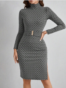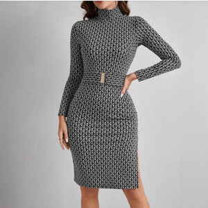现货 亚马逊欧美跨境新款2025年秋冬复古高领印花长袖开叉连衣裙