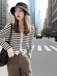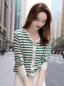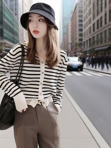 精纺羊毛针织衫撞色条纹显瘦长袖薄款上衣圆领开衫初秋外套2025新