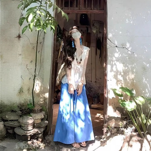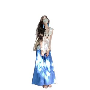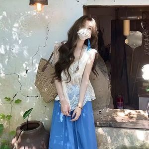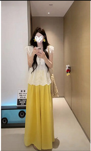 2025年新作夏Vネックレーススモールフライングスリーブ微透けニッチトップハイウエストコントラストカラーワイドレッグパンツ2点セット