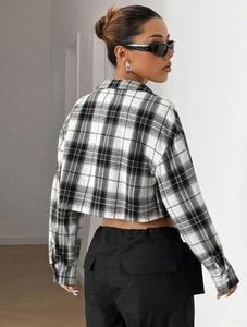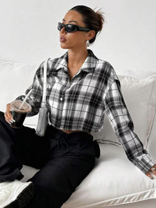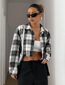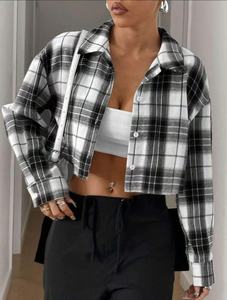跨境2025新款欧美女装休闲翻领格子衬衫亚马逊单排扣开衫短外套女