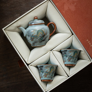 天青汝窑祥龙一壶二杯茶具套装开片可养陶瓷茶壶茶杯送客户伴手礼