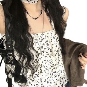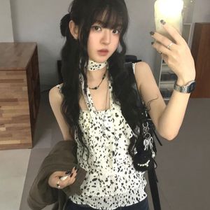 韓国の甘いヒョウ柄フリルノースリーブトップ甘くてクールなホットガールホルターネックレースアップルーズキャミソール