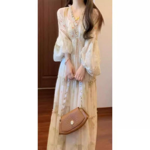 新中式超仙碎花连衣裙春季新款收腰休闲新款女法式绝美长裙子夏女