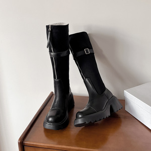 两穿拉链显瘦机车靴女2025秋冬新款圆头厚底时装靴皮带扣高筒靴潮