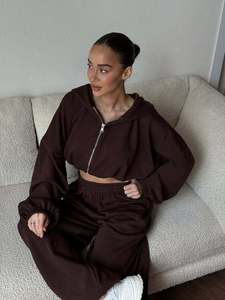 欧美女士休闲套装纯色长袖拉链开衫抽绳连帽卫衣运动松紧裤二件套