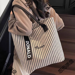 夏ストライプキャンバスバッグ女性のための 2025 新しい大容量クラスのハンドバッグ韓国スタイルのショルダー通勤トートバッグ