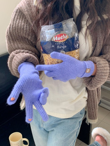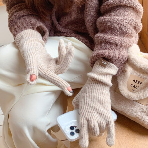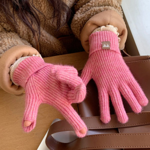 ins糖豆手套女冬季保暖加绒漏指毛线针织可触屏骑车防风骑行手套