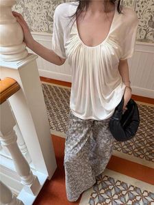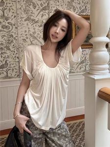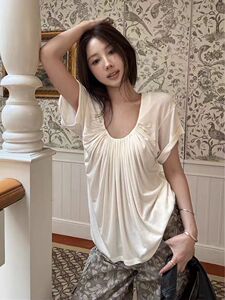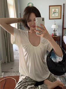 フレンチレトロ薄手プリーツUネックTシャツレディース2025夏新デザインゆったりシック半袖トップトレンディ