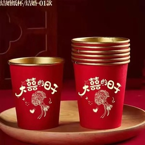 婚庆用品宴席一次性纸杯结婚加厚金箔红色喜婚礼婚宴敬茶水杯批发