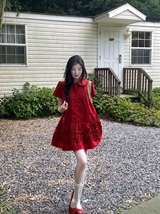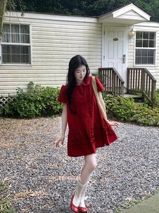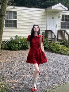 2025 新しい赤いベビードールカラー半袖ドレス女性の夏のレトロ年齢軽減耳 A ラインスカートショートスカート
