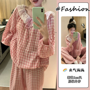 跨境外贸爆款韩版甜美大翻领蕾丝花边睡衣女春秋外穿家居服女套装