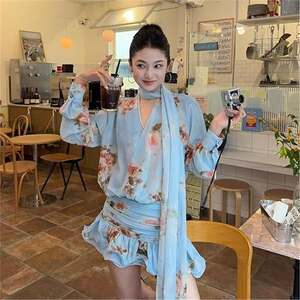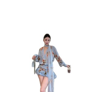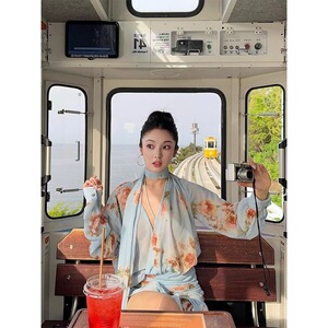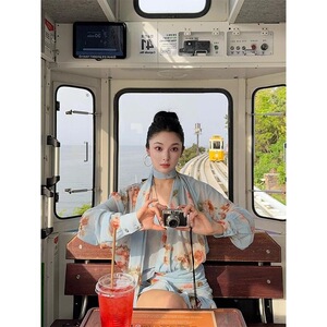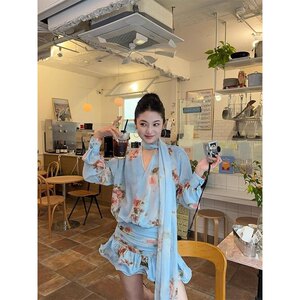 レイジースタイルアイランドホリデーリボンプリントドレス夏の新しい女性ニッチ気質長袖シャツドレス