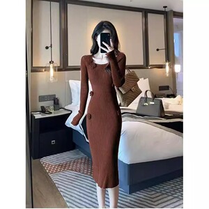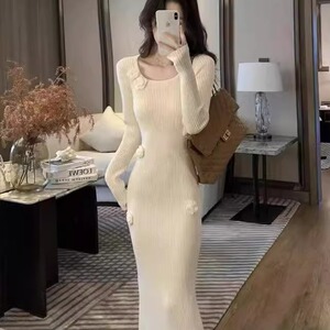 フレンチレトロ立体フラワーニットドレス女性のための2024秋冬気質セータースカートウエストカバーヒップロングスカート