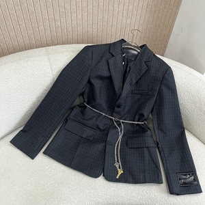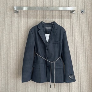 25秋季新款通勤御姐风加大链环装饰毛边细格纹西装外套女款