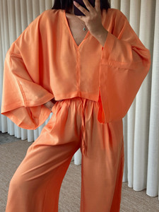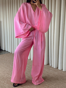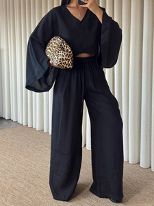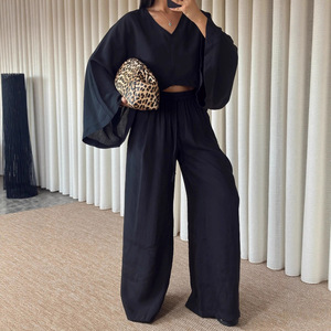 2025跨境亚马逊新款外贸女装欧美休闲纯色宽袖时尚套装长裤两件套