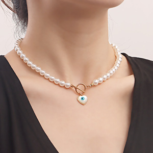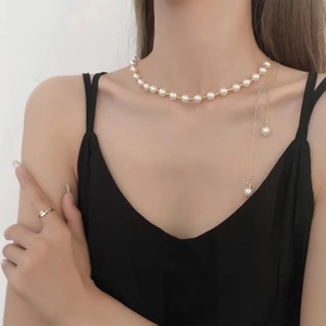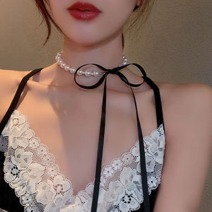 ヨーロッパとアメリカのクロスボーダージュエリー、売れ筋のライトラグジュアリーパールネックレス、甘くてクールなリボンリボン、ラブ鎖骨チェーンネックレス