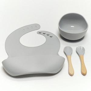 シルバーグレー(子供用ボウル+よだれかけ+木製ハンドル+スプーン+フォーク)