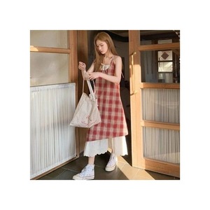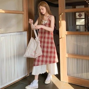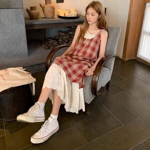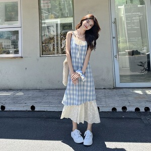 蕾丝拼接格子吊带裙连衣裙女2025夏季新款清新宽松显瘦假两件裙子