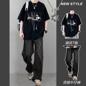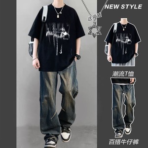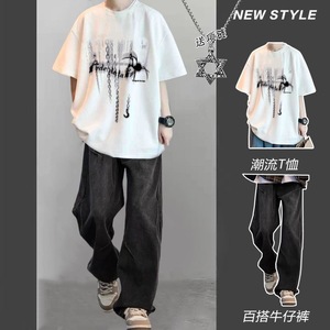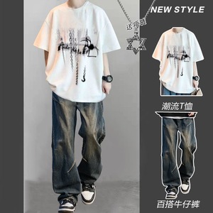 高级感短袖套装男夏季美式潮流t恤搭配痞帅牛仔裤男生夏装两件套