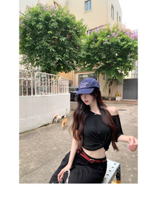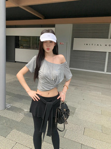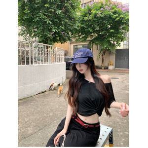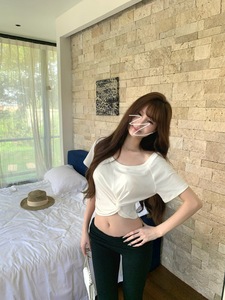 夏用の女性用ホワイトオフショルダー半袖Tシャツ、ニッチなツイストオフショルダースリムフィットショートホットガールトップ